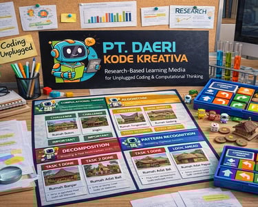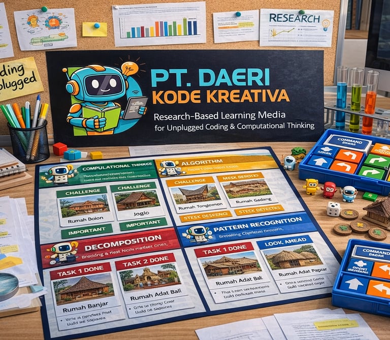 Seluruh media pembelajaran PT Daeri Kode Kreativa termasuk gameboard edukatif, media computational thinking, dan alat belajar kontekstual lainnya dirancang berdasarkan hasil penelitian peneliti, kebutuhan nyata di lapangan, serta pendekatan pedagogis yang teruji. Produk dikembangkan agar dapat digunakan tanpa ketergantungan teknologi tinggi, sehingga inklusif dan adaptif untuk berbagai jenjang pendidikan.