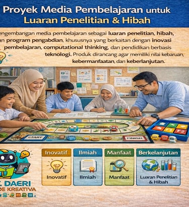 PT Daeri Kode Kreativa terlibat dalam pengembangan media pembelajaran sebagai luaran penelitian, hibah, dan program pengabdian, khususnya yang berkaitan dengan inovasi pembelajaran, computational thinking, dan pendidikan berbasis teknologi. Produk dirancang agar memiliki nilai kebaruan, kebermanfaatan, dan keberlanjutan.