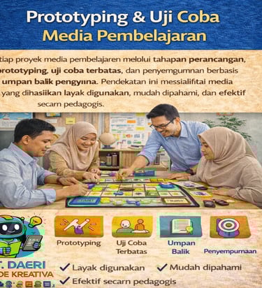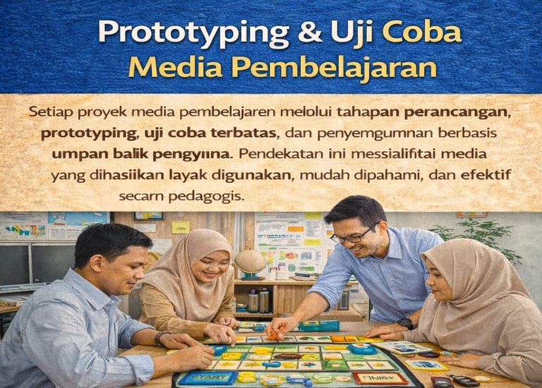 Setiap proyek media pembelajaran melalui tahapan perancangan, prototyping, uji coba terbatas, dan penyempurnaan berbasis umpan balik pengguna. Pendekatan ini memastikan media yang dihasilkan layak digunakan, mudah dipahami, dan efektif secara pedagogis..