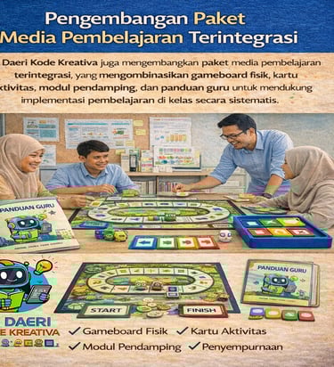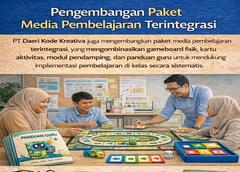 PT Daeri Kode Kreativa juga mengembangkan paket media pembelajaran terintegrasi, yang mengombinasikan gameboard fisik, kartu aktivitas, modul pendamping, dan panduan guru untuk mendukung implementasi pembelajaran di kelas secara sistematis.