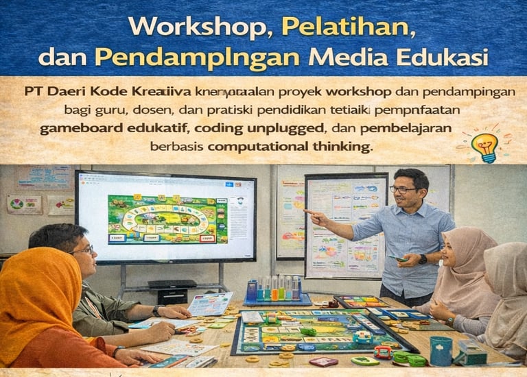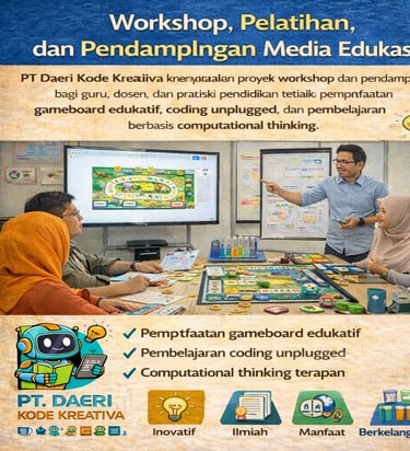 Selain produk, PT Daeri Kode Kreativa menjalankan proyek workshop dan pendampingan bagi guru, dosen, dan praktisi pendidikan terkait pemanfaatan gameboard edukatif, coding unplugged, dan pembelajaran berbasis computational thinking.