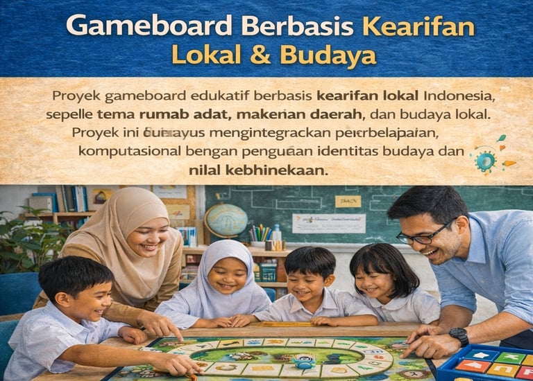 PT Daeri Kode Kreativa menginisiasi proyek gameboard edukatif berbasis kearifan lokal Indonesia, seperti tema rumah adat, makanan daerah, dan budaya lokal. Proyek ini bertujuan mengintegrasikan pembelajaran komputasional dengan penguatan identitas budaya dan nilai kebhinekaan.