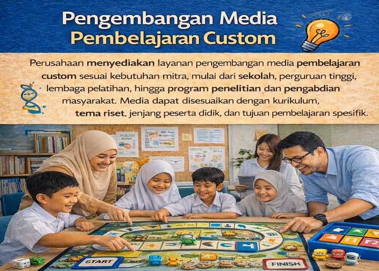 Perusahaan menyediakan layanan pengembangan media pembelajaran custom sesuai kebutuhan mitra, mulai dari sekolah, perguruan tinggi, lembaga pelatihan, hingga program penelitian dan pengabdian masyarakat. Media dapat disesuaikan dengan kurikulum, tema riset, jenjang peserta didik, dan tujuan pembelajaran spesifik.